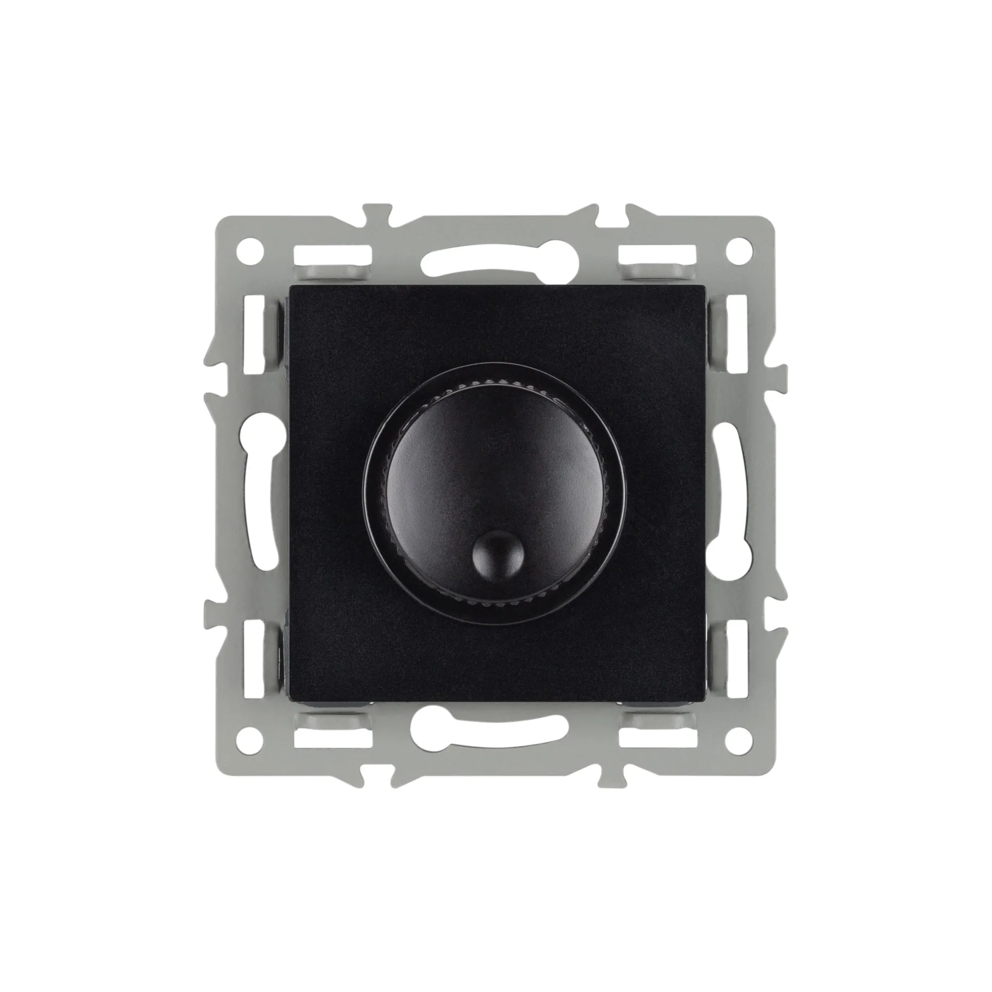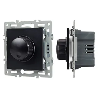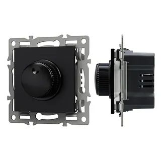 Механизм регулировки света на 1 пост, с суппортом из алюминия. Цвет - черный. Без фронтальной рамки. Уровень пылевлагозащиты - IP20. Механизм устанавливается в стандартный круглый подрозетник. Максимальная нагрузка 300 Вт только для ламп накаливания и галогенных, 100 Вт только для энергосберегающих и светодиодных ламп.