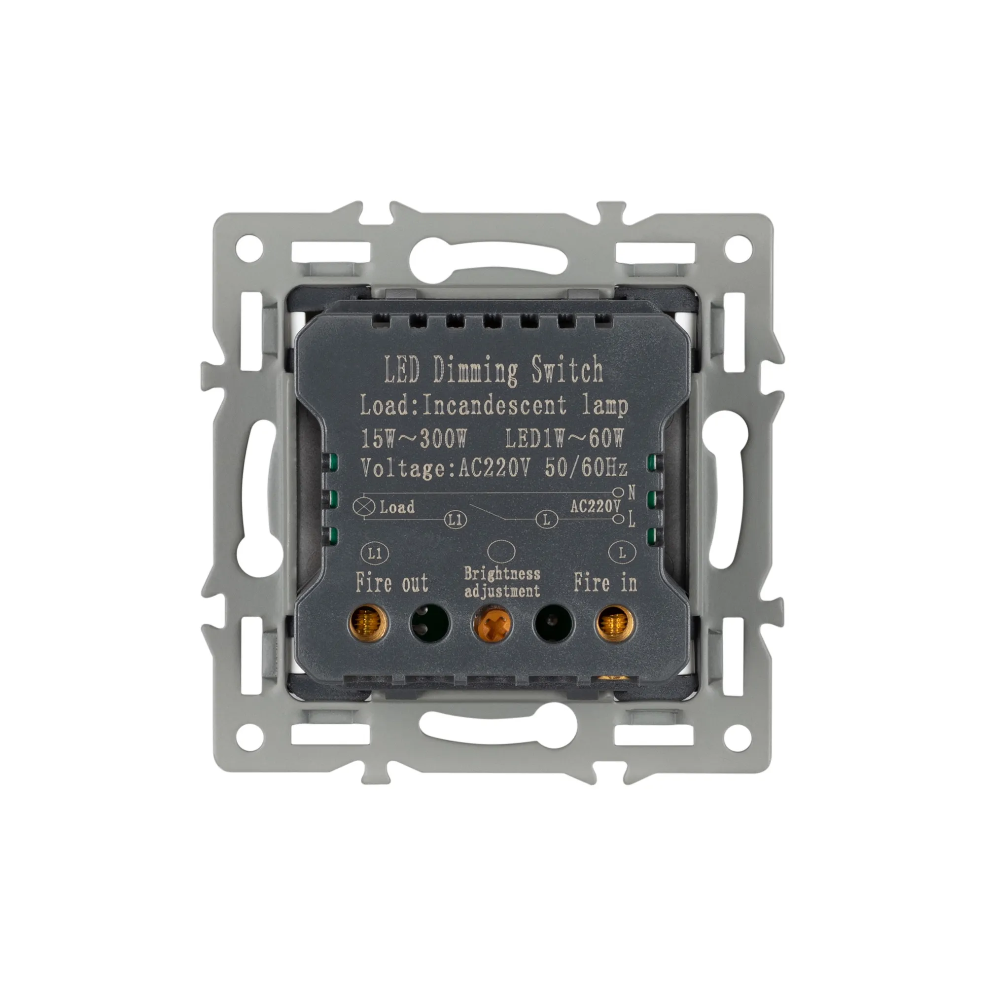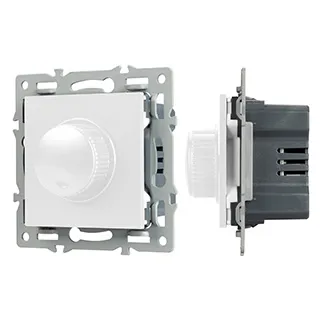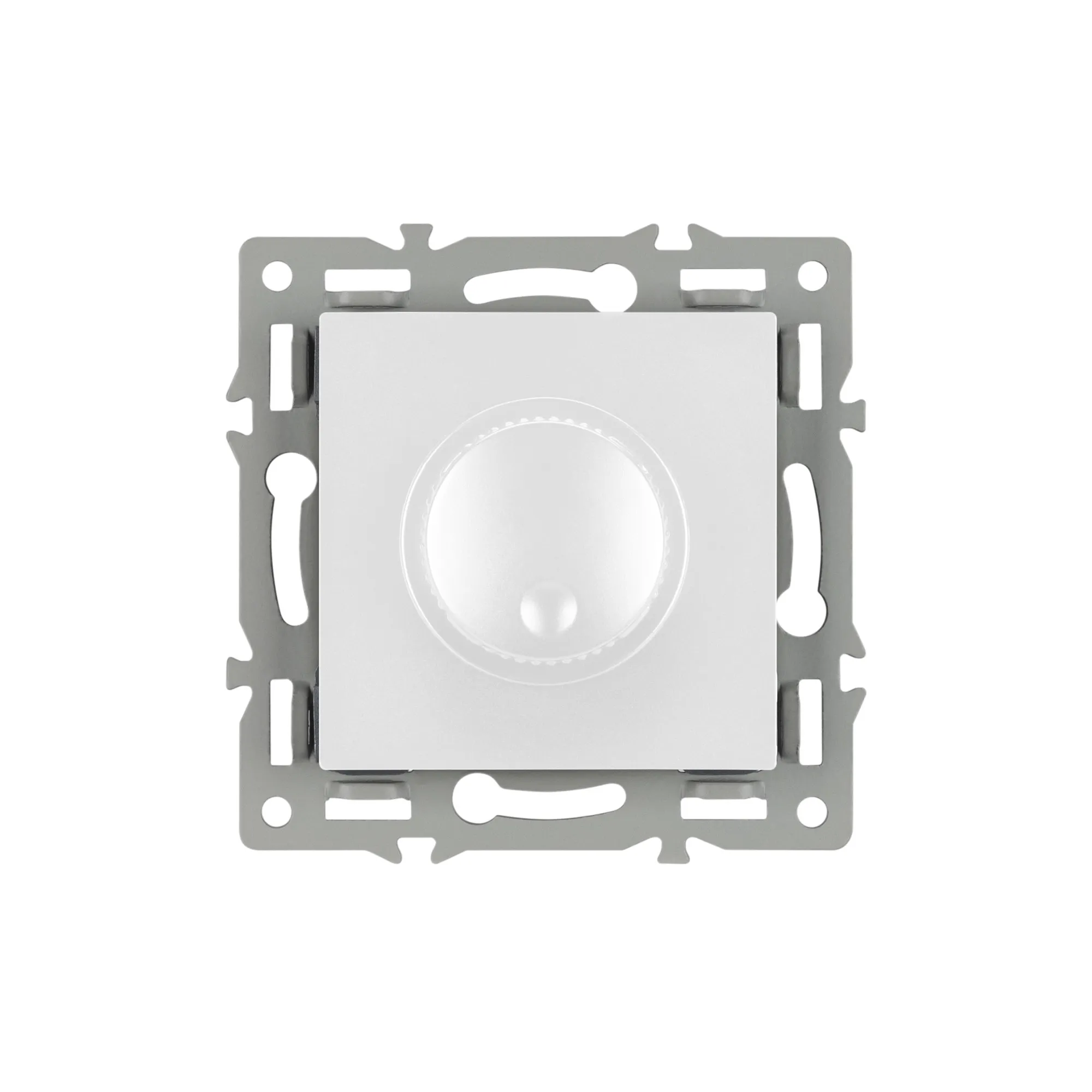 Механизм регулировки света на 1 пост, с суппортом из алюминия. Цвет - белый. Без фронтальной рамки. Уровень пылевлагозащиты - IP20. Механизм устанавливается в стандартный круглый подрозетник. Максимальная нагрузка 300 Вт только для ламп накаливания и галогенных, 100 Вт только для энергосберегающих и светодиодных ламп.