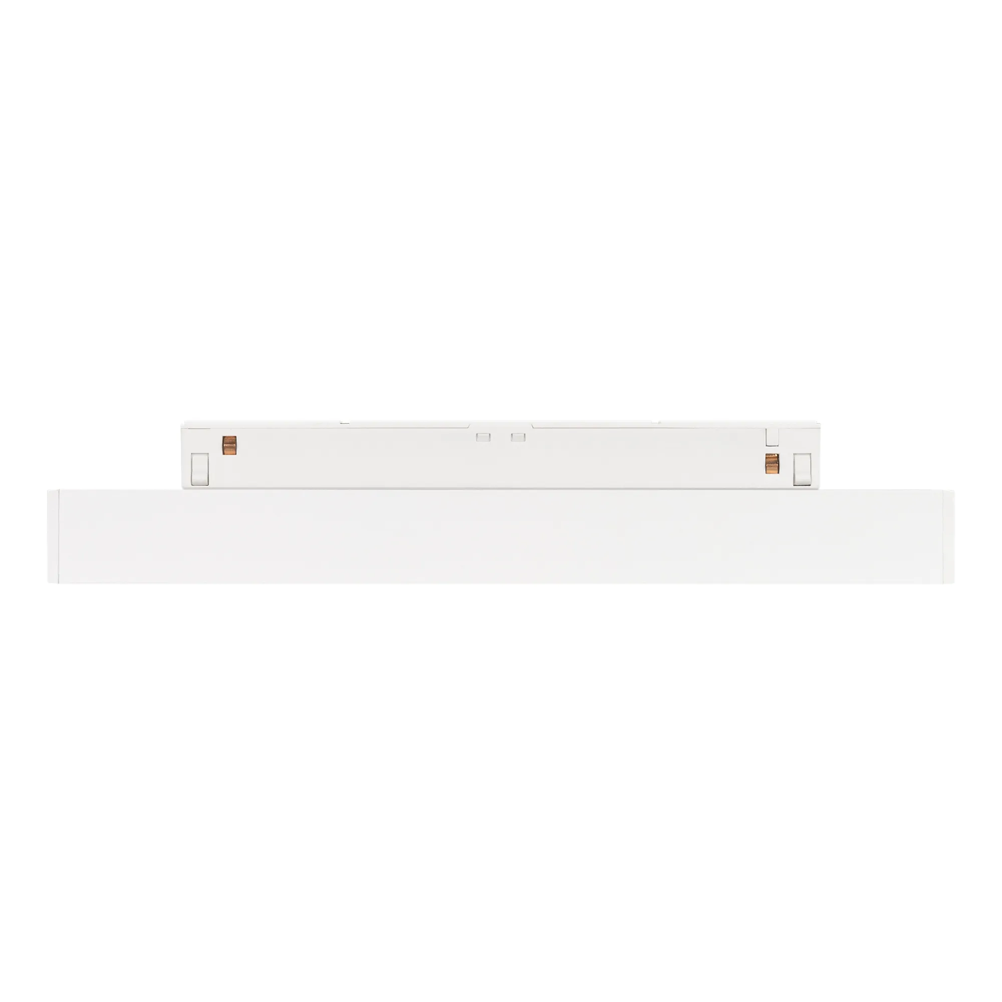 Светильник для магнитных треков MAG-ORIENT шириной 26 мм. Мощность 8 Вт, св. поток 640 лм, 80 лм/Вт, теплый 2700 K, CRI>90, угол 100°, напряжение питания 48 В. Белый прямоугольный корпус из металл, экран поликарбонат, степень защиты IP20. Размер: длина 235 мм, ширина 22 мм, высота 42 мм. Монтаж на трек MAG-ORIENT. Пульсация <1%.