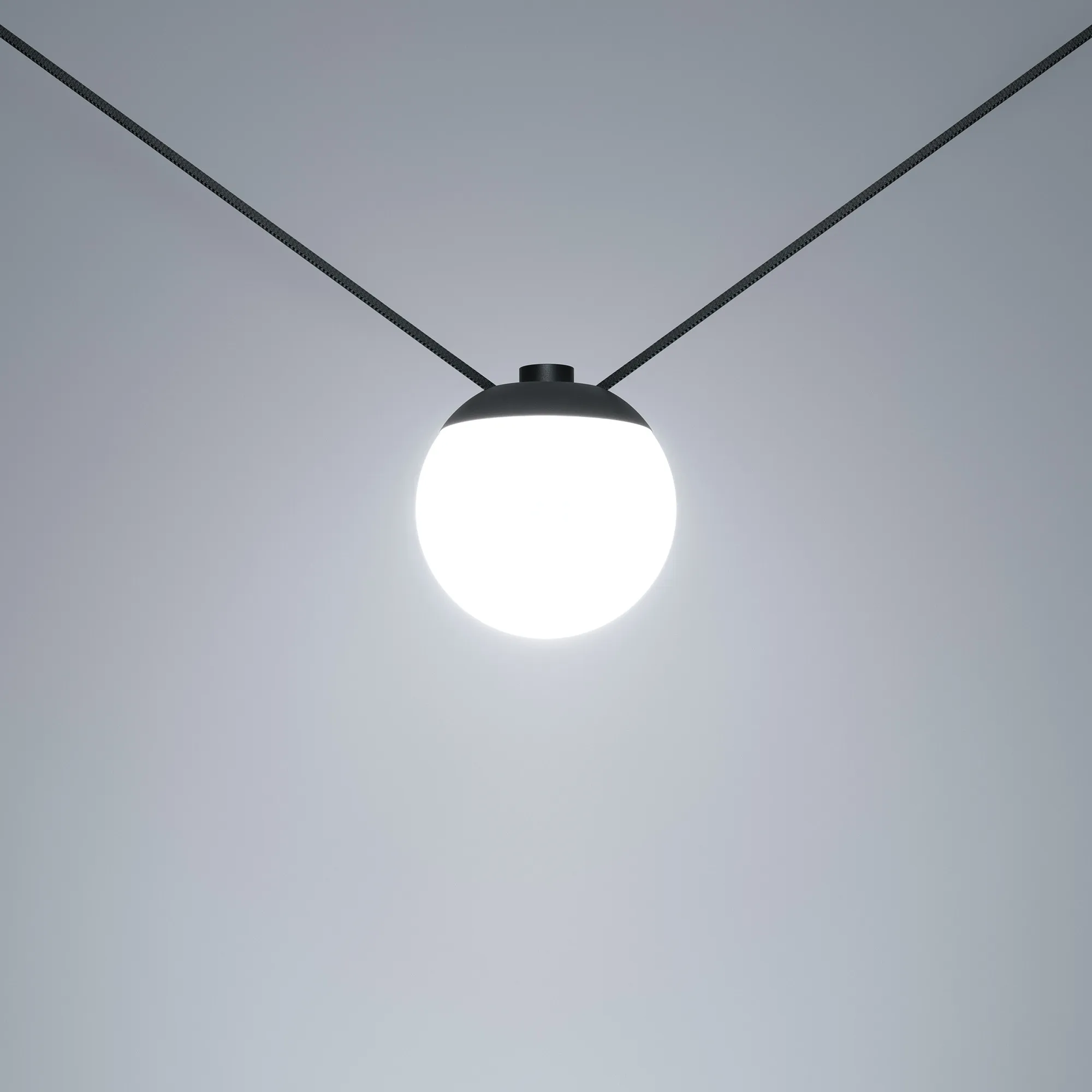 Светильник ART-INBELT-SFERO-R140. Мощность 7 Вт, св. поток 825 лм, 118 лм/Вт, изменяемая цветовая температура 2700-6500 К, CRI>92, угол 240°, напряжение питания 48 В. Степень защиты IP20. Размер: Ø140 x 131 мм. Монтаж на токопроводящий ремень INBELT. Цвет корпуса черный. DALI.