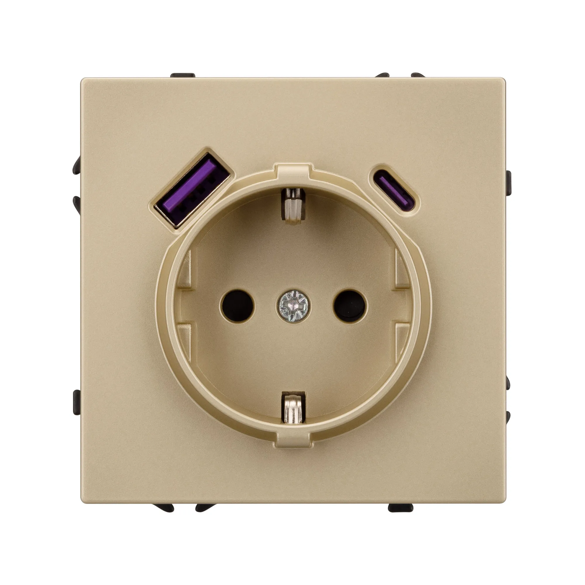 Механизм розетки с заземлением 1 пост и 2 USB Type A+C порта. Цвет - золотой песок, с Soft-Touch покрытием. Без фронтальной рамки. Уровень пылевлагозащиты IP20. Розетка устанавливается в стандартный подрозетник круглого сечения диаметром 60мм.