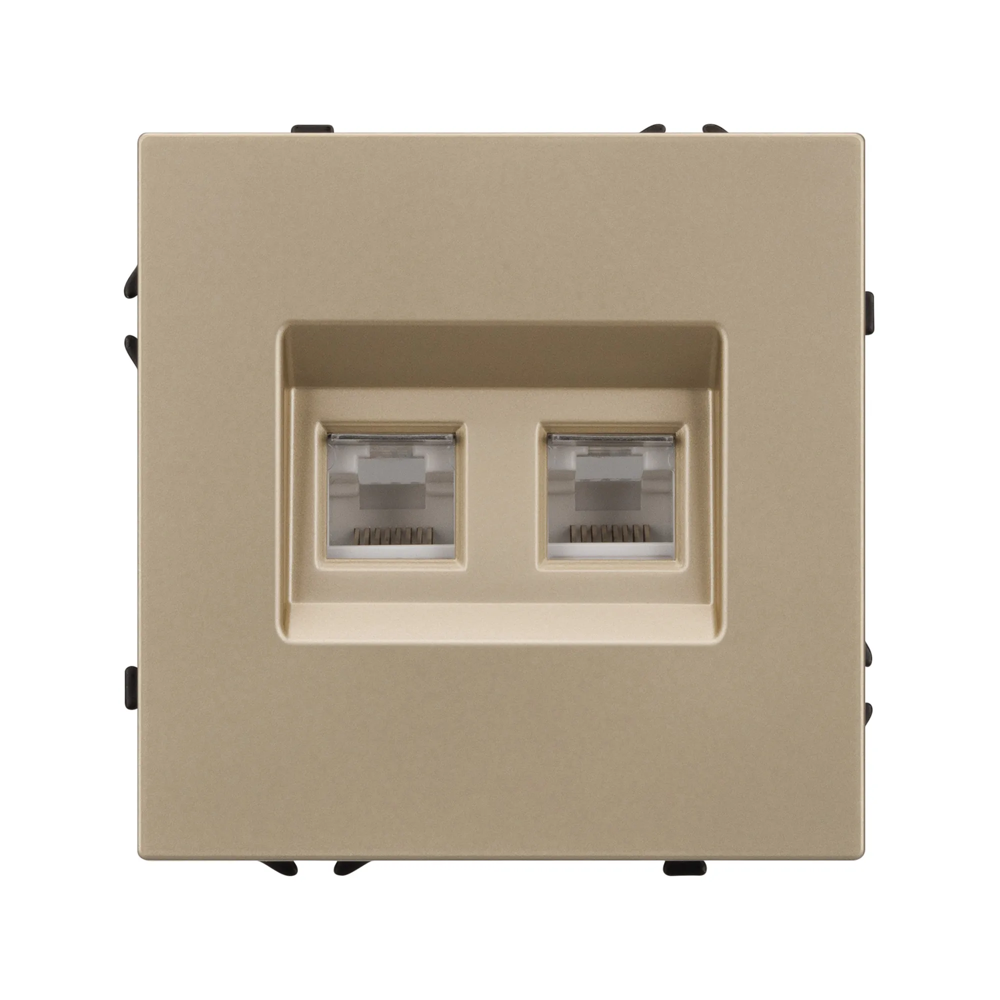 Механизм компьютерной розетки на 2 поста 6-й категории. Цвет - золотой песок, с Soft-Touch покрытием. Без фронтальной рамки. Уровень пылевлагозащиты IP20. Тип подключаемого разъема - RJ45. Розетка устанавливается в стандартный подрозетник круглого сечения диаметром 60мм.