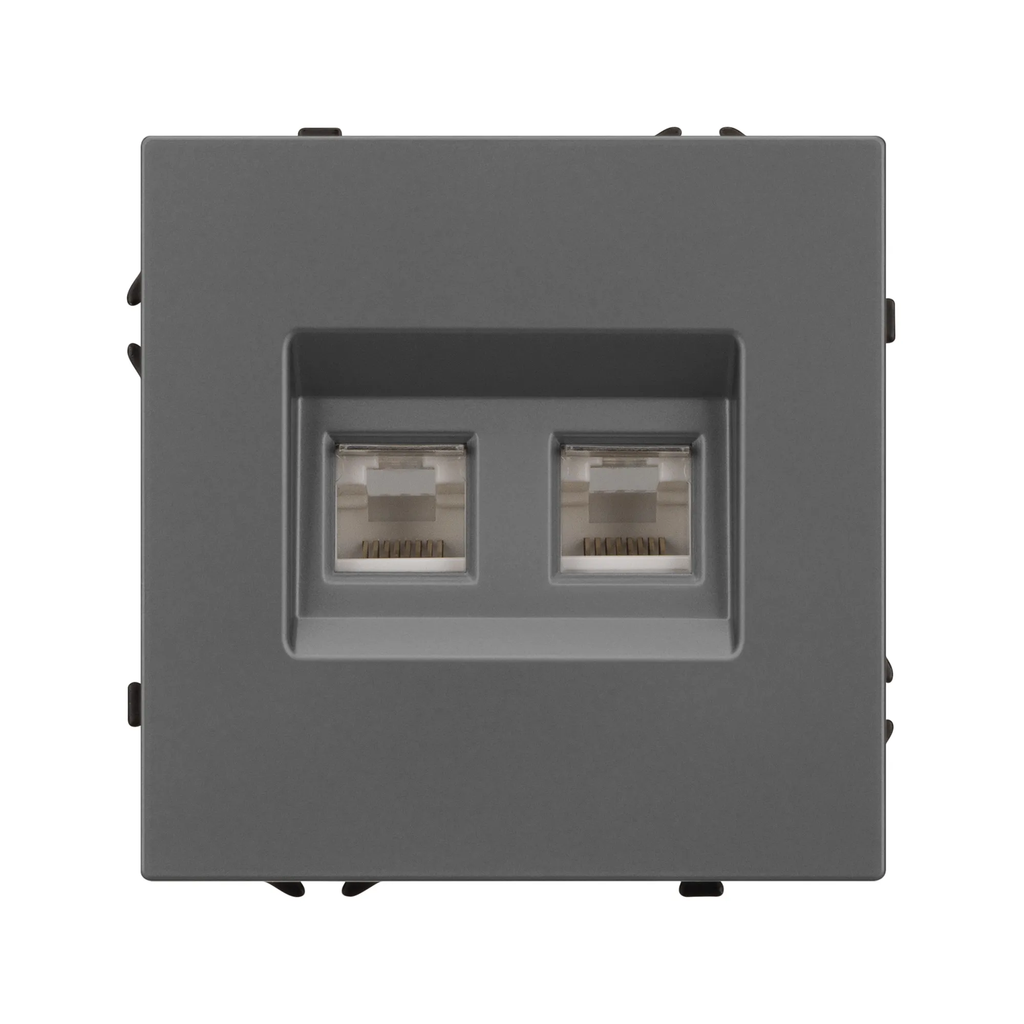 Механизм компьютерной розетки на 2 поста 6-й категории. Цвет - серый базальт, с Soft-Touch покрытием. Без фронтальной рамки. Уровень пылевлагозащиты IP20. Тип подключаемого разъема - RJ45. Розетка устанавливается в стандартный подрозетник круглого сечения диаметром 60мм.
