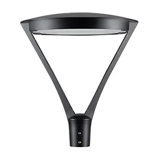 Поставка под заказ от 5 шт. Венчающий светодиодный светильник. Мощность 50 Вт, св. поток 6180 лм, 123 лм/Вт, дневной 4000 K, CRI>80, угол 145х60°, напряжение питания 230 В. Чёрный корпус из алюминия, экран закаленное стекло, степень защиты IP65. Размер: диаметр 465 мм, высота 520 мм. Монтаж на вертикальную опору диаметром 60 мм.