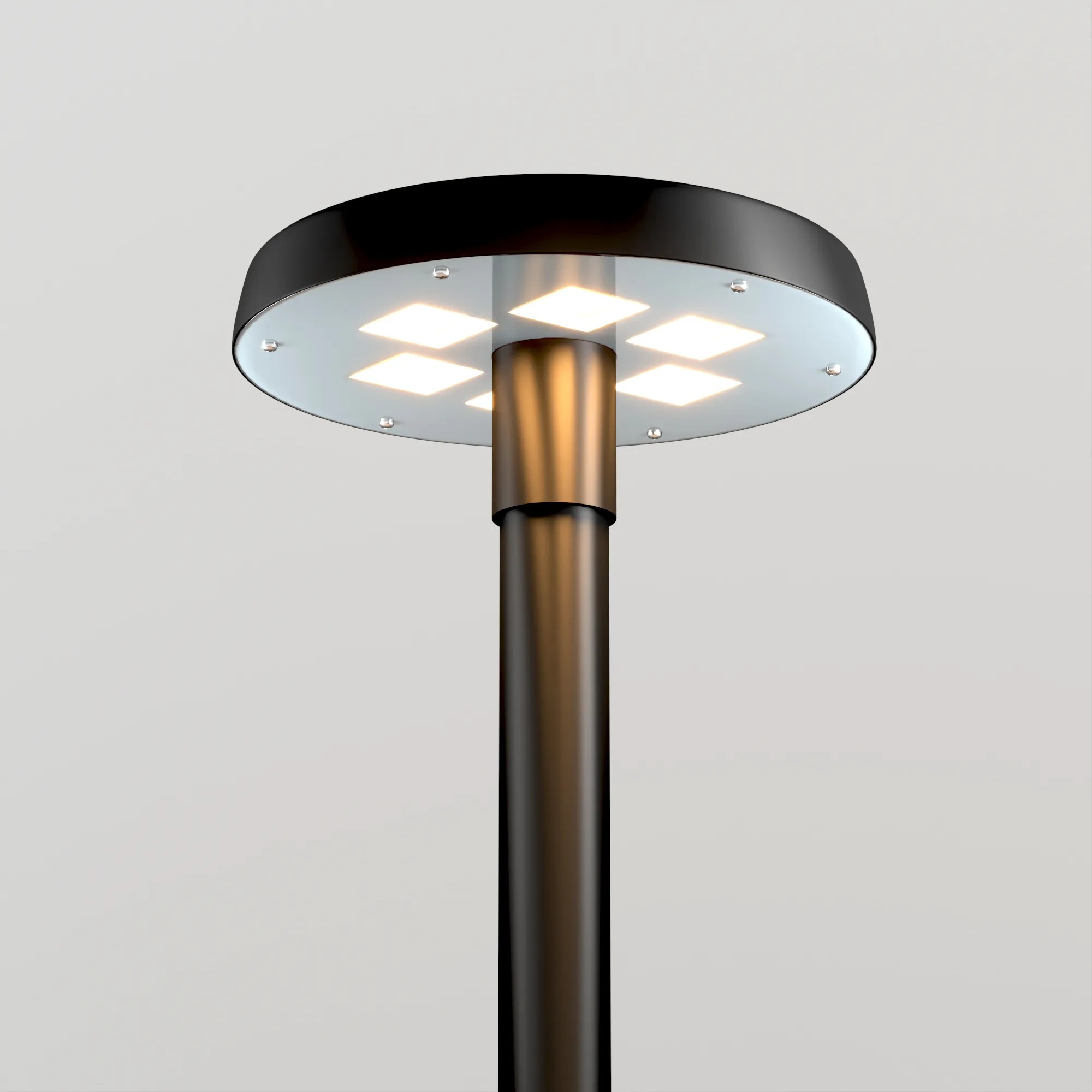 Венчающий светодиодный светильник. Мощность 50 Вт, св. поток 5680 лм, 112 лм/Вт, тёплый 2700 K, CRI>80, угол 140°, напряжение питания 230 В. Черный корпус из алюминия, экран закаленное стекло, степень защиты IP65. Размер: диаметр 510 мм, высота 200 мм. Монтаж на вертикальную опору диаметром 76 мм.