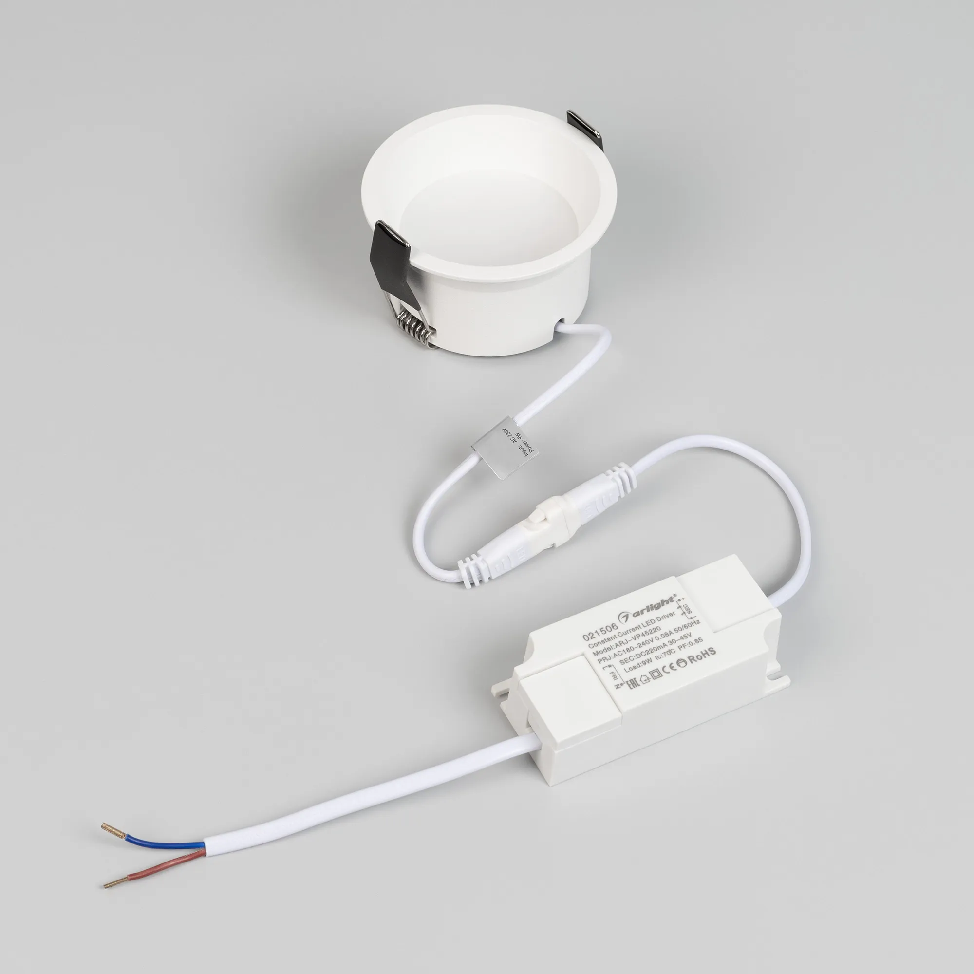 Встраиваемый светильник даунлайт. Мощность 9 Вт, св. поток 595 лм, 66 лм/Вт, дневной 4000 K, CRI>90, угол 85°, напряжение питания 230 В. Белый круглый корпус из алюминия, степень защиты IP20. Размер: диаметр 82 мм, высота 46 мм. Монтаж встраиваемый, установочное отверстие: диаметр 75 мм. Драйвер 27-42 В, 200 мА, пульсация <2%.
