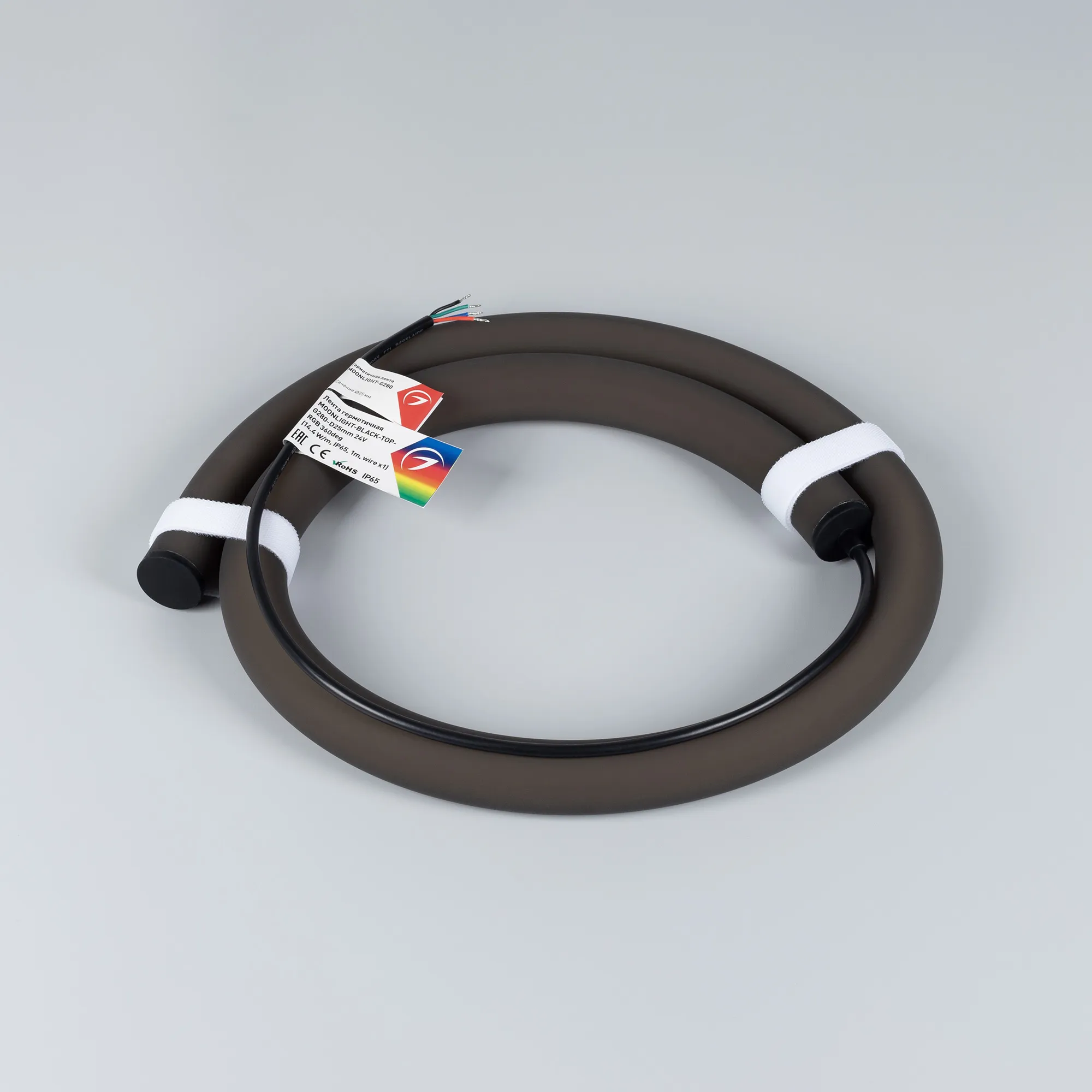 В магазине Мельковский Свет Вы можете купить "Лента герметичная MOONLIGHT-BLACK-TOP-G280-D25mm 24V RGB 360deg (14.4 W/m, IP65, 1m, wire x1) (Arlight, Вывод прямой, 3 года)"