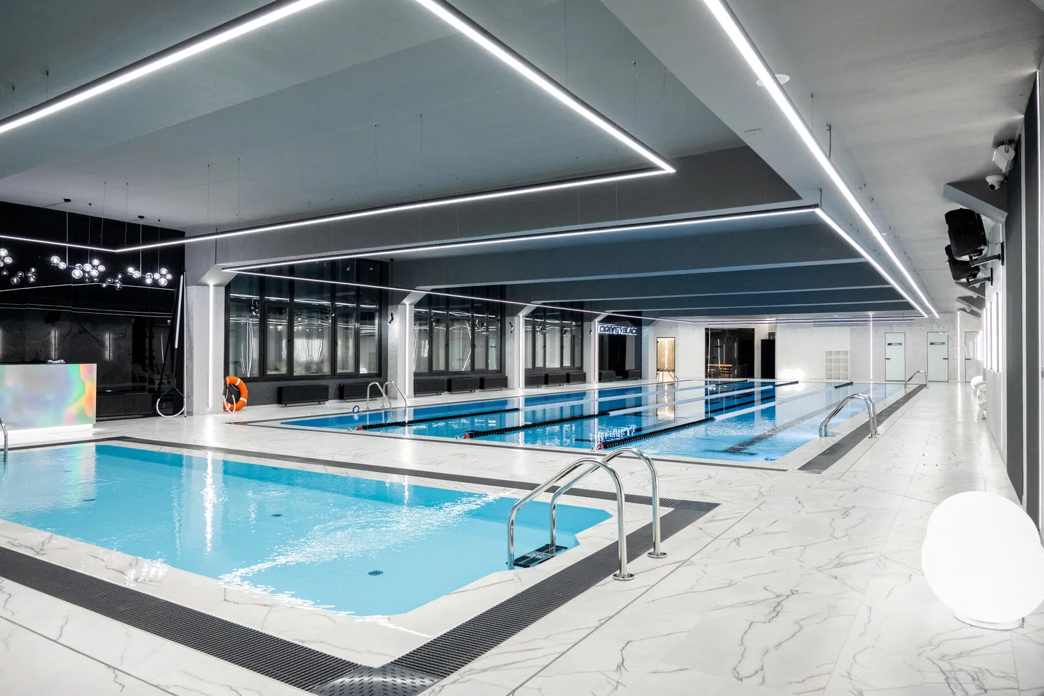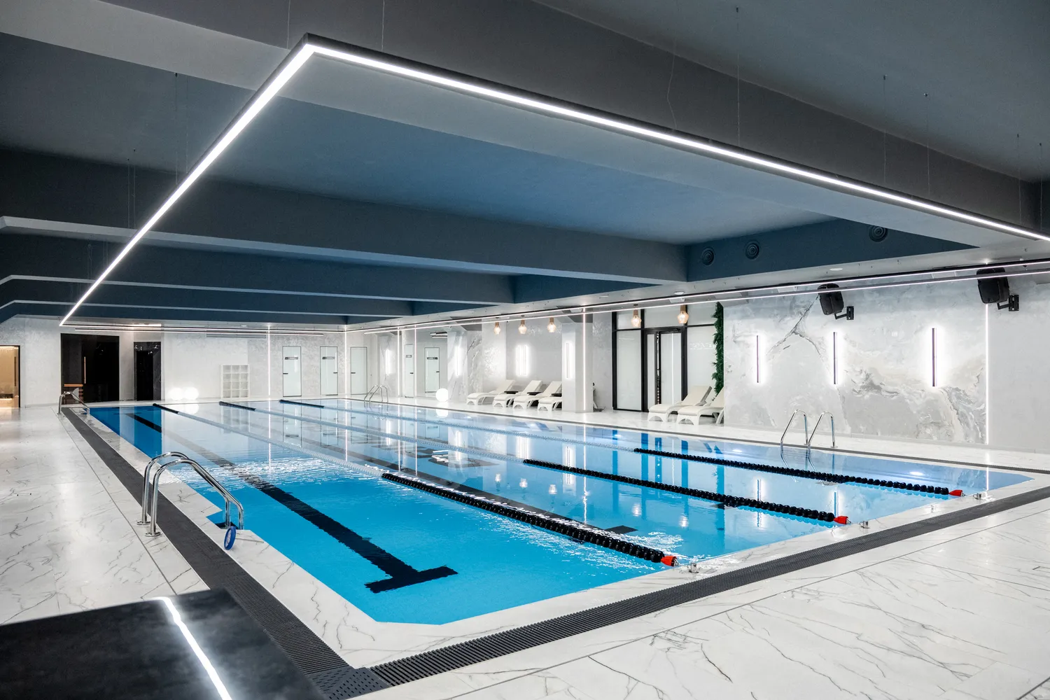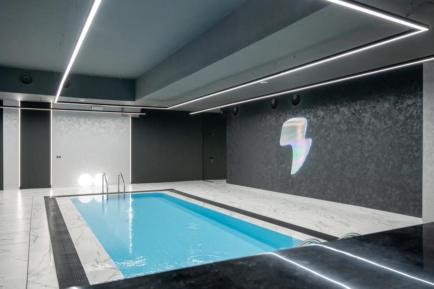 - Профильные светильники: были выбраны в качестве основы системы освещения. Обеспечивают равномерный уровень освещенности и могут быть разной формы, цвета и мощности в зависимости от помещения. В этом проекте они присутствуют практически во всех помещениях , включая бассейн.