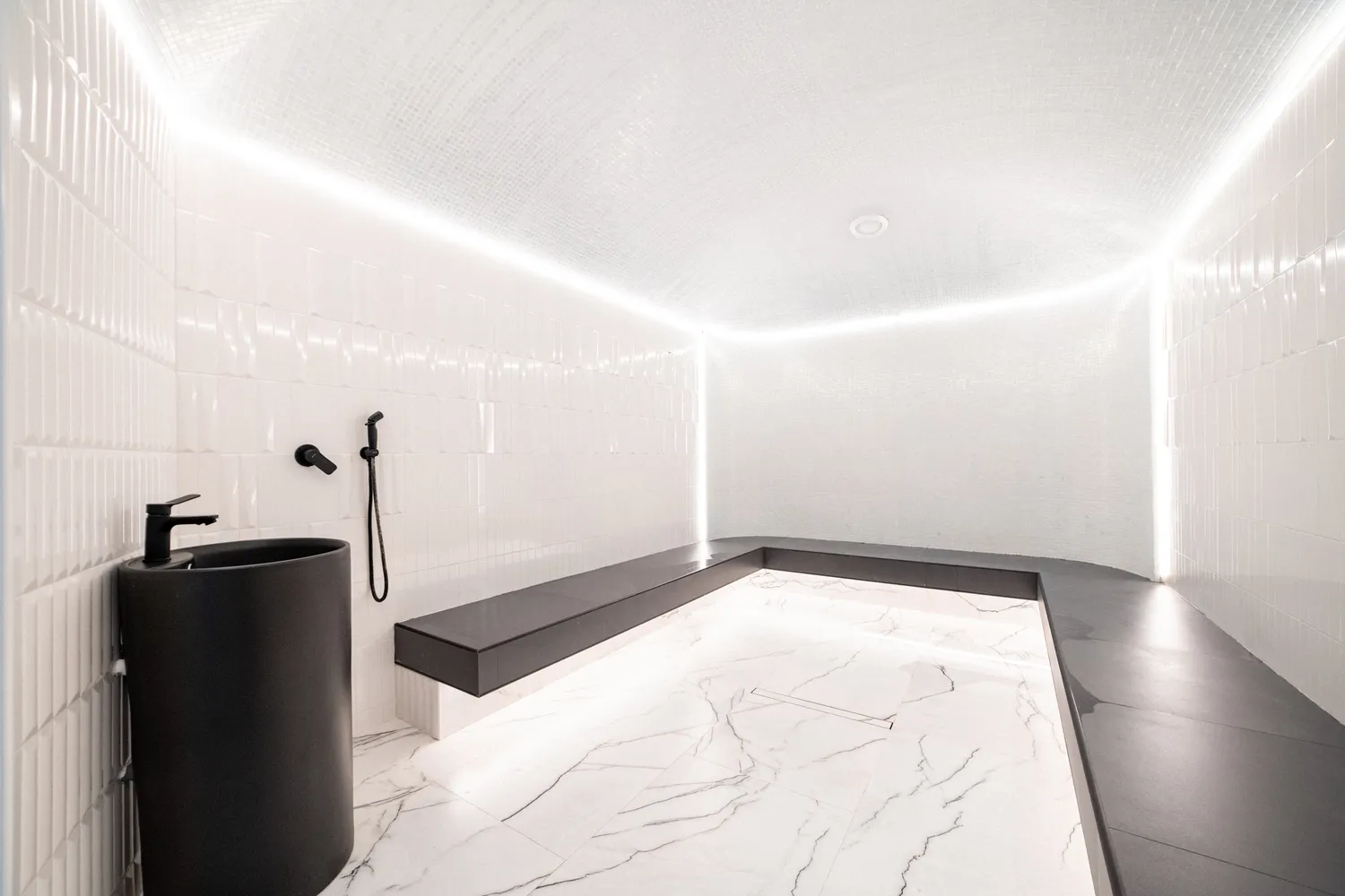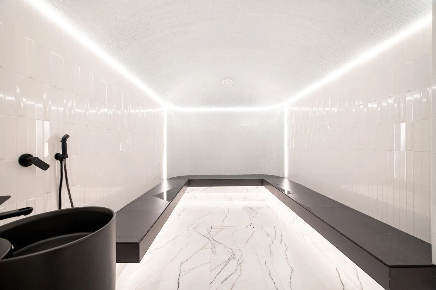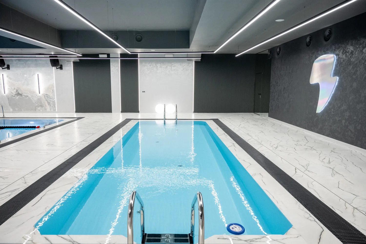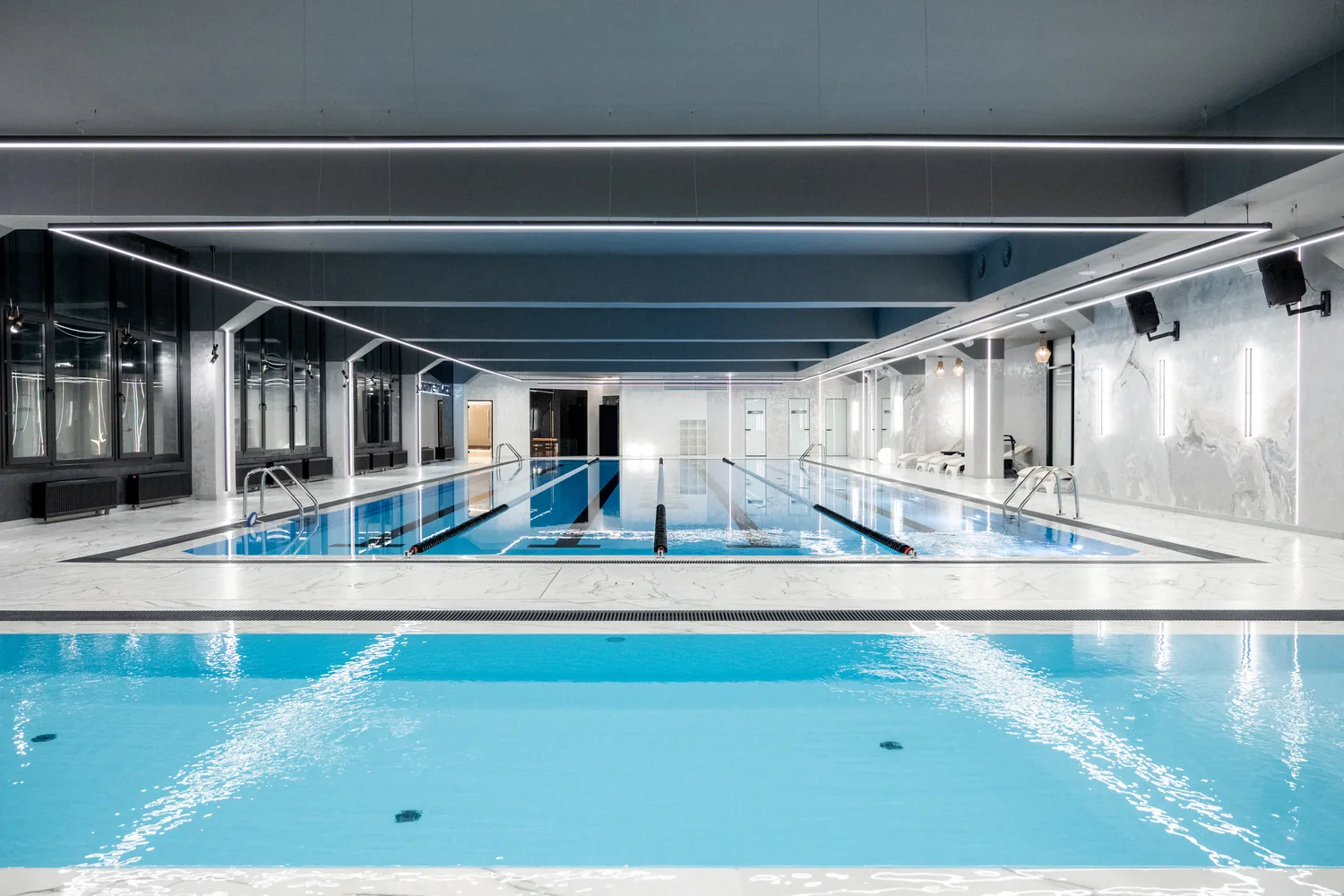 - Профильные светильники: были выбраны в качестве основы системы освещения. Обеспечивают равномерный уровень освещенности и могут быть разной формы, цвета и мощности в зависимости от помещения. В этом проекте они присутствуют практически во всех помещениях , включая бассейн.