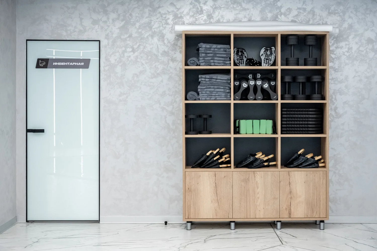 - Трековые светильники: крепятся к шинопроводу и позволяют легко перемещать светильники по потолку, что удобно для изменения направления света. Они были использованы для таких помещений как: рецепшн, зона единоборств, тренажерный зал.