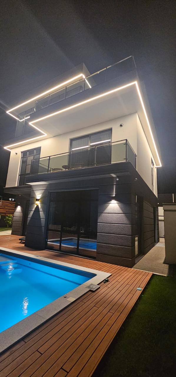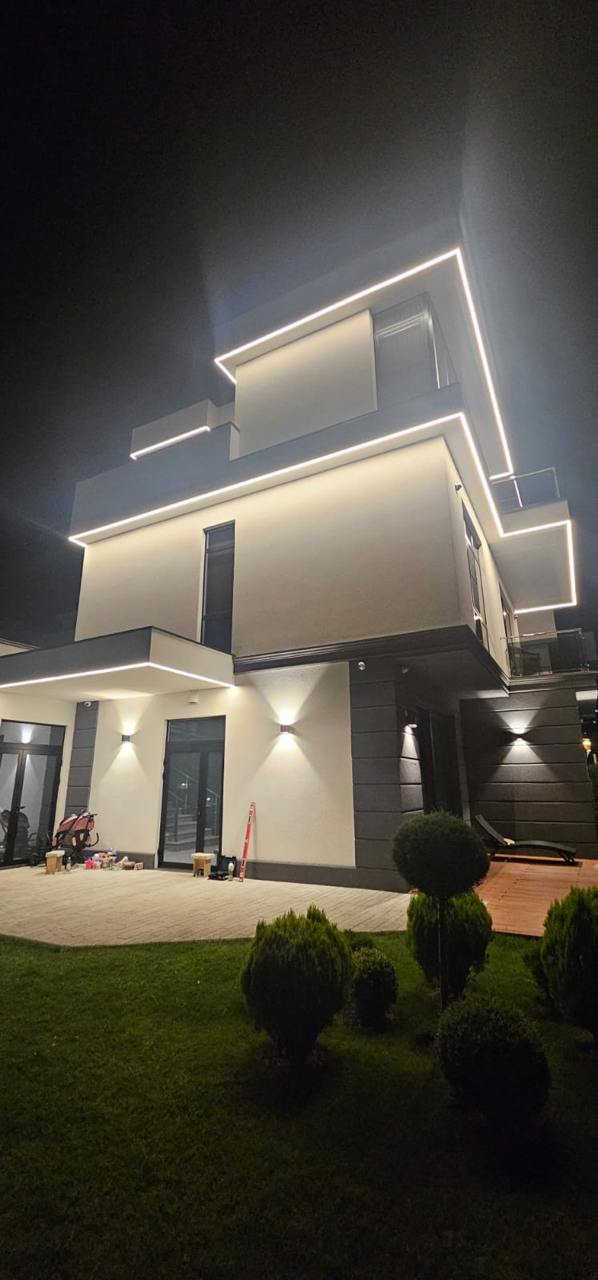 Контурная подсветка дома выполнена герметичной светодиодной лентой серии RTW с высокой степенью пылевлагозащиты. А также тонкие профили S-LUX с матовым рассеивателем из поликарбоната со светопропусканием 63%, который равномерно рассеивает свет, размывая точки светодиодов на поверхности, и обеспечивает надежную защиту светодиодной ленты от воздействия внешних факторов, таких как грязь и пыль.
