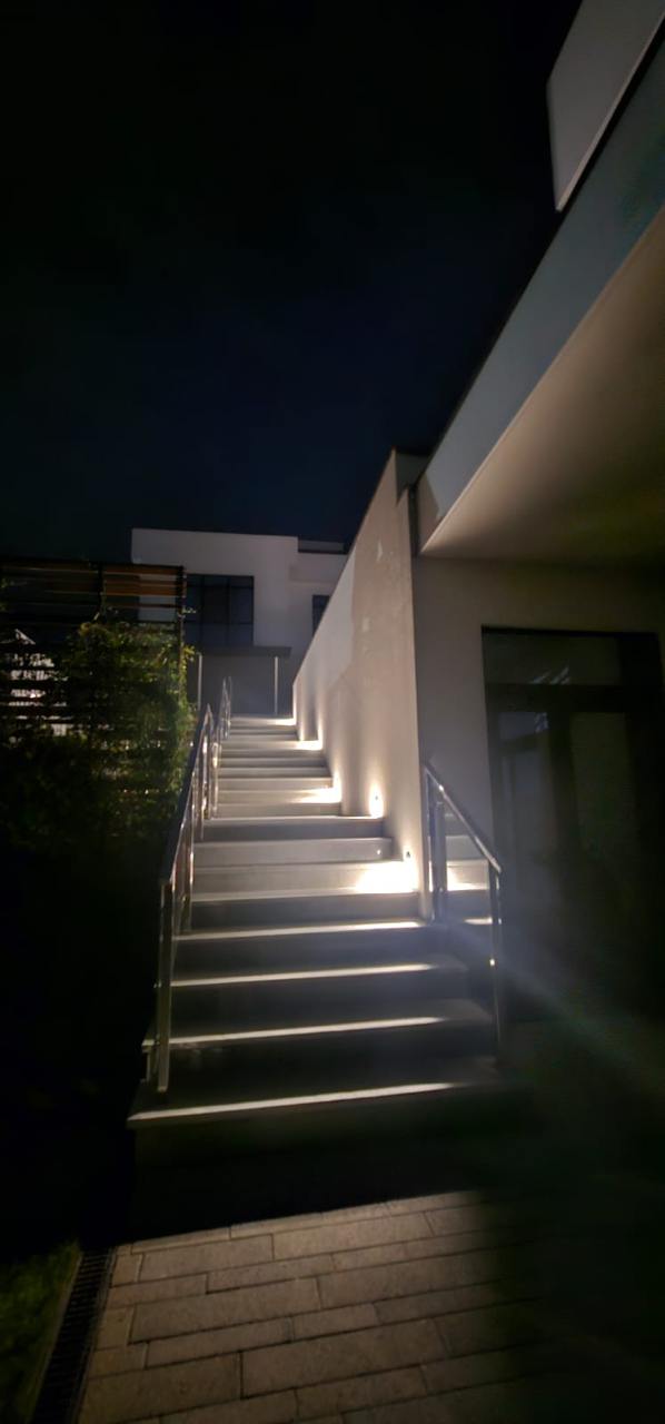 Для подсветки лестниц используется встраиваемый светильник серии LTD-TRAIL с асимметричным светораспределением мощностью 4 Вт, теплого цвета свечения (3000К) отличается компактным размером и небольшой глубиной встройки. Корпус светильника изготовлен из алюминия, окрашенного порошковой краской в черный цвет, рассеиватель надежно скрыт внутри корпуса.